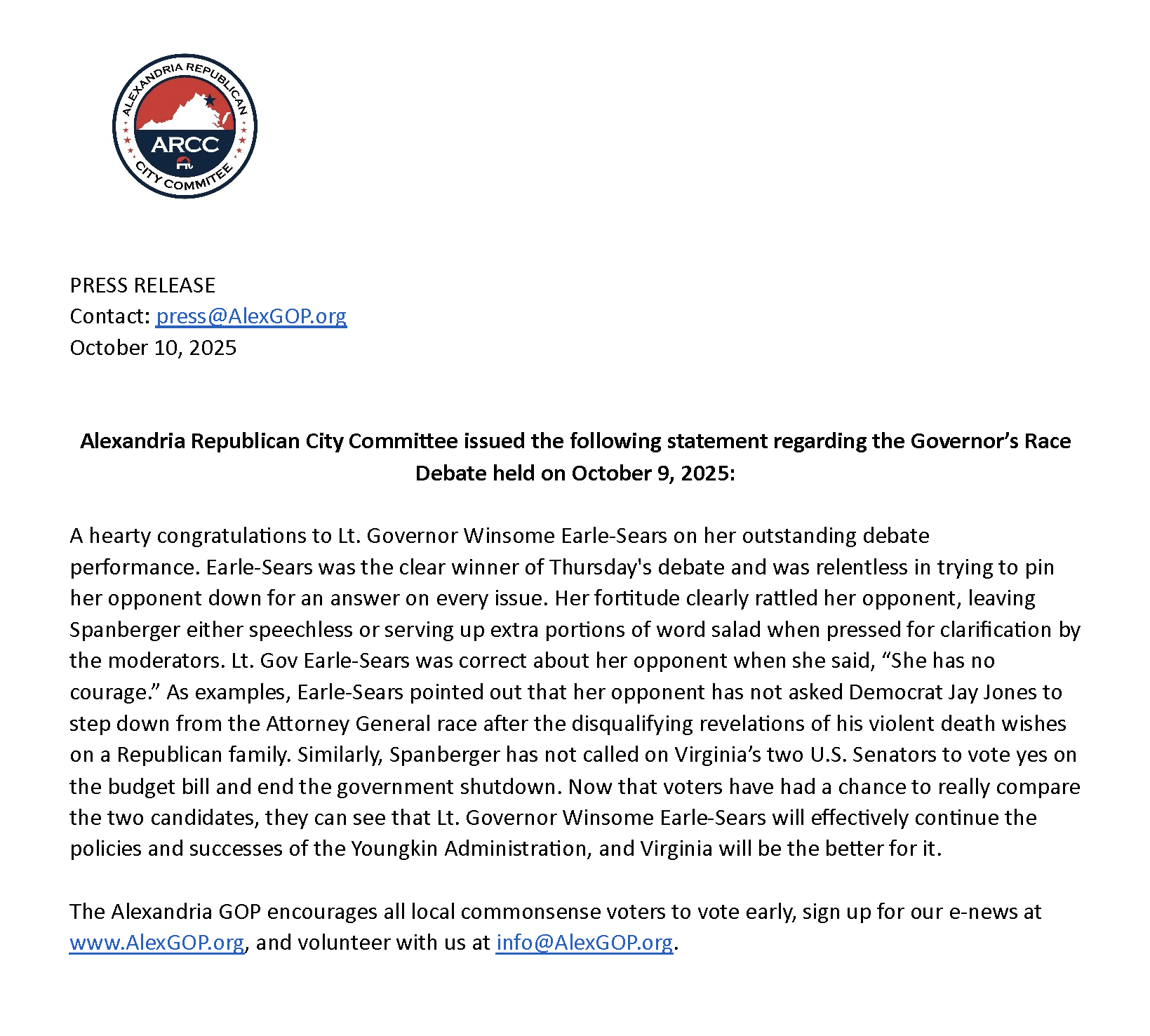 Alexandria Republican City Committee Issued the Following Statement Regarding the Governor’s Race